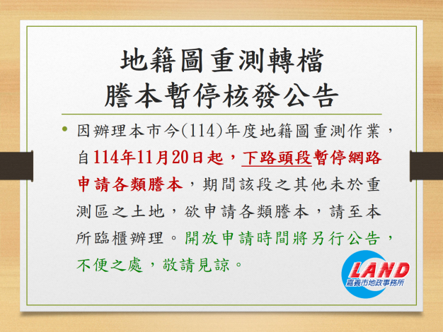 本市今(114)年度辦理地籍圖重測區為下路頭段,重測結果於11月19日(三)公告期滿,地政機關即應據以辦理土地標示變更登記,重測後新地段地籍圖資料及建物測量成果圖等將暫停核發,重新開放申請時間待轉檔作業完成將另行公告,造成不便,敬請見諒。若權利人對重測區內相關圖籍需諮詢,請洽嘉義市地政事務所(05) ...更多