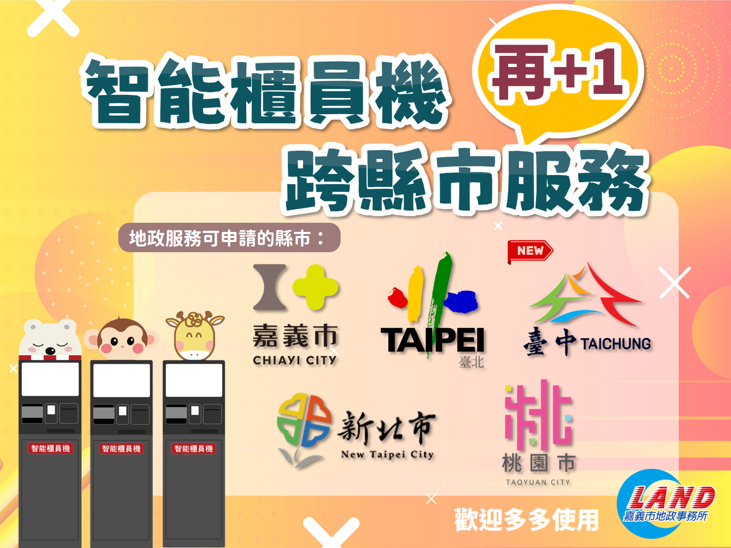 為了讓民眾申請地籍謄本更加便利,嘉義市推出「智能櫃員機」服務,申請範圍除了原有的嘉義市、新北市、桃園市、臺北市外,自即日(1/12)起,新增臺中市各行政區範圍內的標的也可申請,歡迎民眾多加利用。
